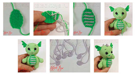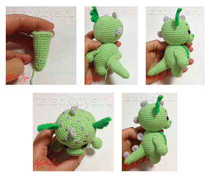 Sew the spikes starting 4 rounds above the eyebrows, between the ears, then continue along the head, body, and tail.