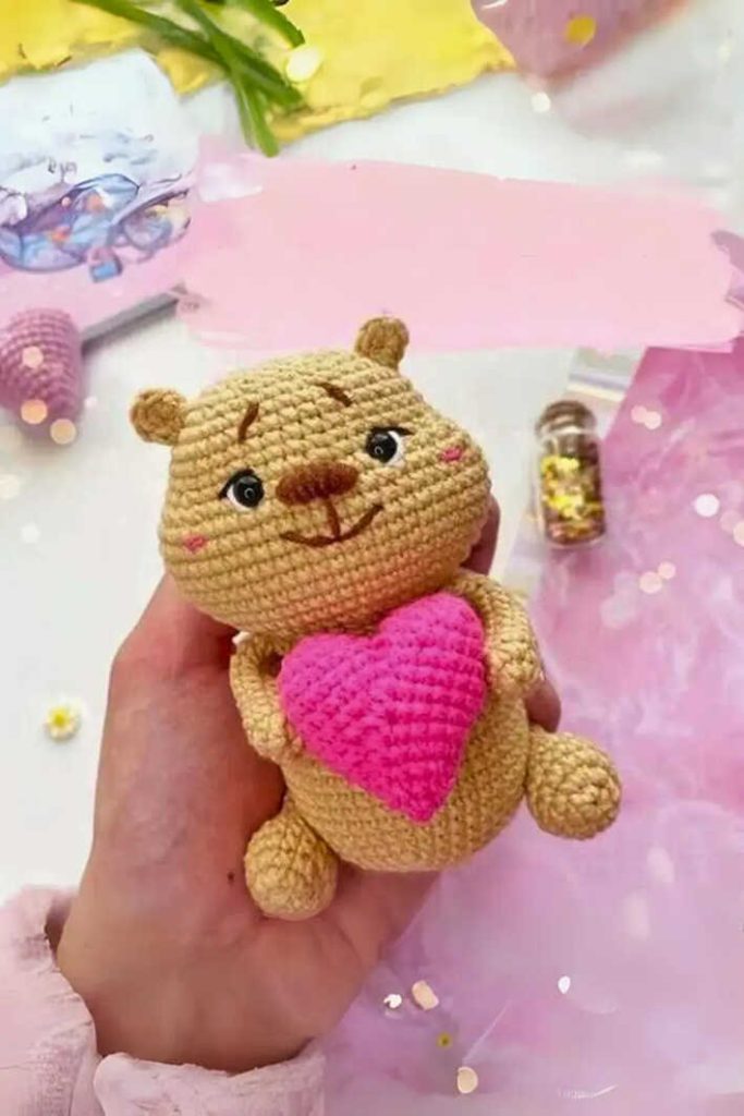 The pattern is designed using YarnArt Jeans, Alize Cotton Gold, or Gazzal Baby Cotton yarn for a clean and well-defined finish. Beige yarn is used for the body, while pink yarn adds the heart and cheek details. You will also need a 1.75 mm crochet hook, safety eyes or beads, fiberfill stuffing, and basic tools. If you enjoy small animal designs, you may also like our mini fox amigurumi pattern.